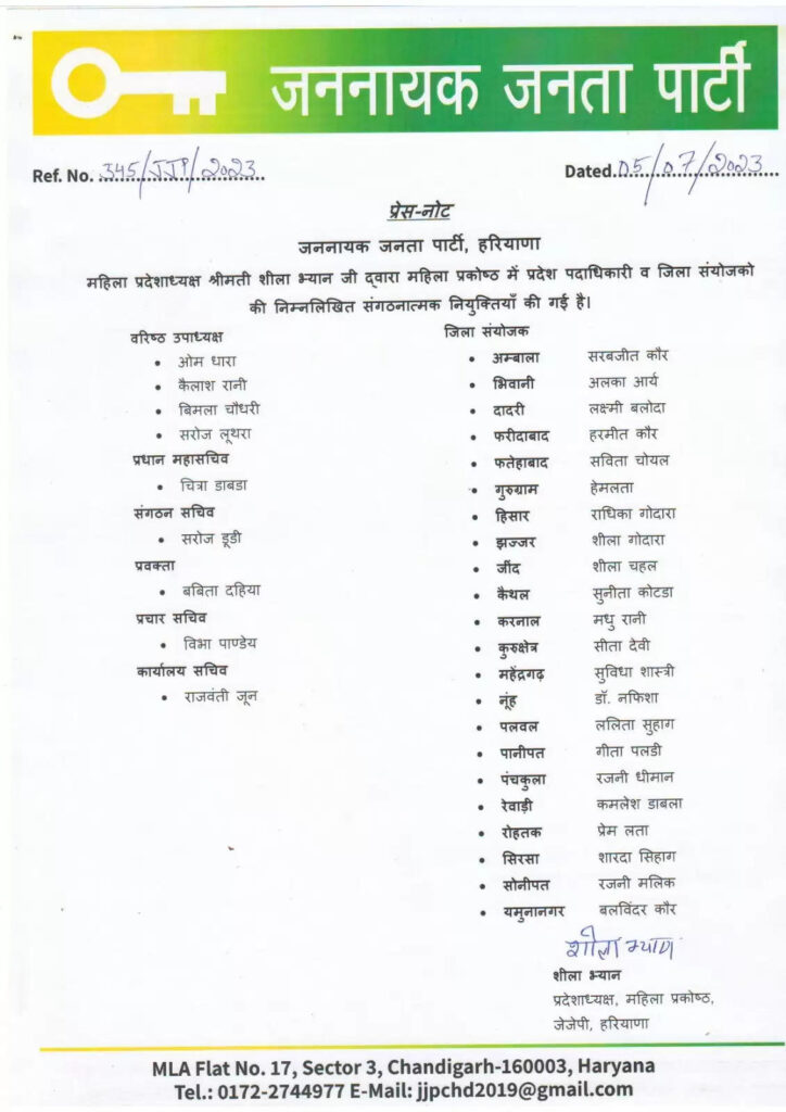हरियाणा में जेजेपी की महिला वोटरों पर नजर, 22 महिला जिला अध्यक्ष समेत 31 पदाधिकारी किए नियुक्त