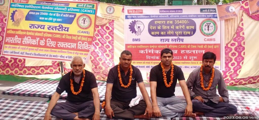 रेवाड़ी, 05 अगस्त (अभीतक) : लिपिकों द्वारा अपने वेतनमान बढ़ोतरी को लेकर गत 5 जुलाई से क्लेरिकल एसोसिएशन वेलफेयर सोसायटी के बैनर तले चली आ रही अनिश्चितकालीन हड़ताल को शनिवार को 32वें दिन एक महीने का समय पूरा हो चुका है। इससे पहले लिपिकीय एसोसिएशन व सरकार के बीच बेनतीजा रह चुकी तीन असफल वार्ताओं के बाद सरकार ने चौथी वार्ता करने के लिए अभी तक तिथि निर्धारित नहीं की है। जिससे कर्मचारियों में सरकार के खिलाफ लगातार रोष बढ़ता जा रहा है। रेवाड़ी जिला में धारा 144 लगाए जाने के कारण सीमित संख्या में कर्मचारी सांकेतिक भूख हड़ताल पर बैठकर सोई हुई सरकार को जगाने का कार्य कर रहे है। शनिवार को क्रमिक भूख हड़ताल के 15वें दिन शिक्षा विभाग के लिपिकीय वर्ग कर्मचारी राजेश कुमार, नरेशपाल, इंद्रजीत व सुलतान सिंह काले कपड़े पहनकर भूख हड़ताल पर बैठे और सरकार के खिलाफ जोरदार नारे लगाकर कड़ा रोष प्रकट किया। शहीद भगत सिंह यादगार कमेटी, धारूहेड़ा की ओर से कर्मचारियों की जायज मांग को पूर्ण समर्थन देते हुए मुख्यंत्री के नाम खुला पत्र लिखकर लिपिक कर्मचारियों का 35400 रूपये मूलवेतनमान लागू करने की मांग की। वहीं शनिवार को नारनौल में क्लेरिकल एसोसिएशन वेलफेयर सोसायटी द्वारा आयोजित मुख्यमंत्री पुतला दहन व काला दिवस कार्यक्रम में रेवाड़ी जिला से राज्य कार्यकारिणी सलाहाकर एवं जोनल कोर्डिनेटर हेमचंद हरितश व दर्जनभर लिपिक कर्मचारियरों ने शामिल होकर सरकार के खिलाफ कड़ा रोष जताया।