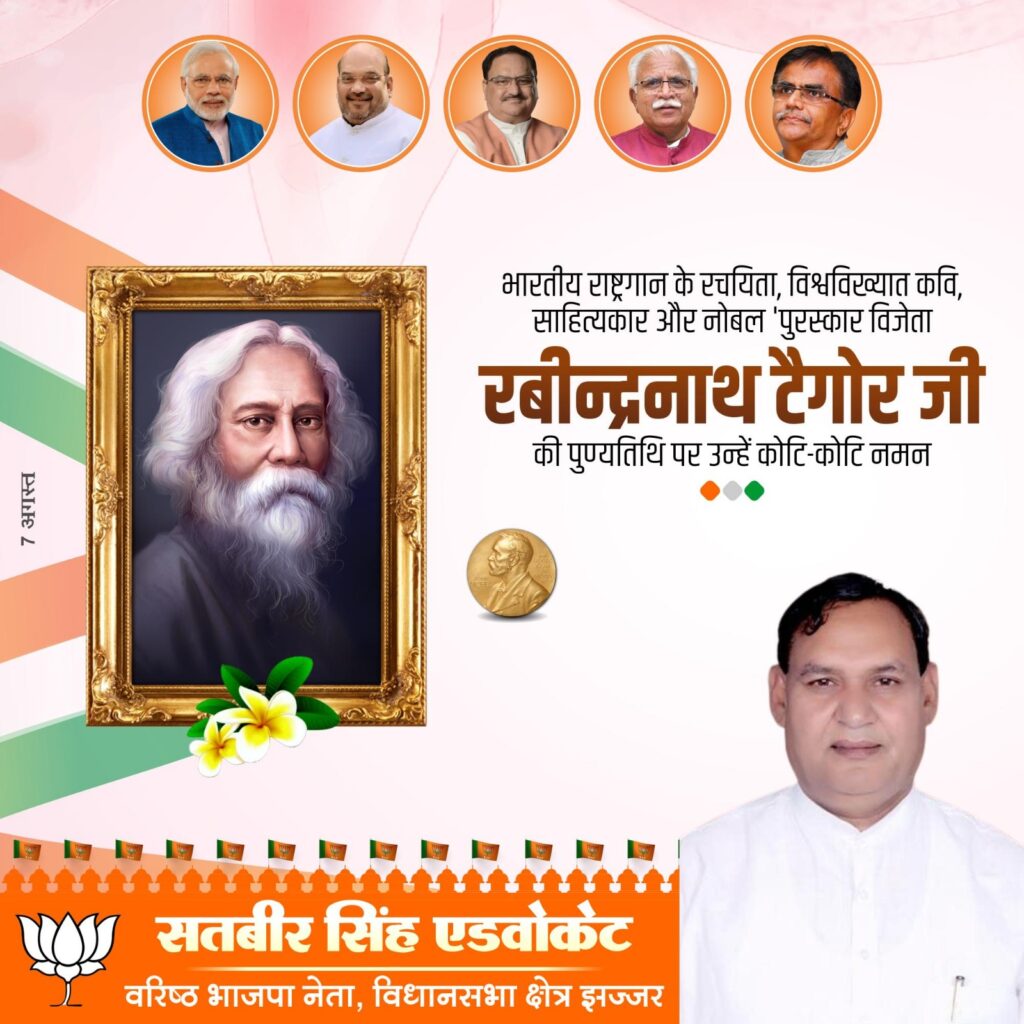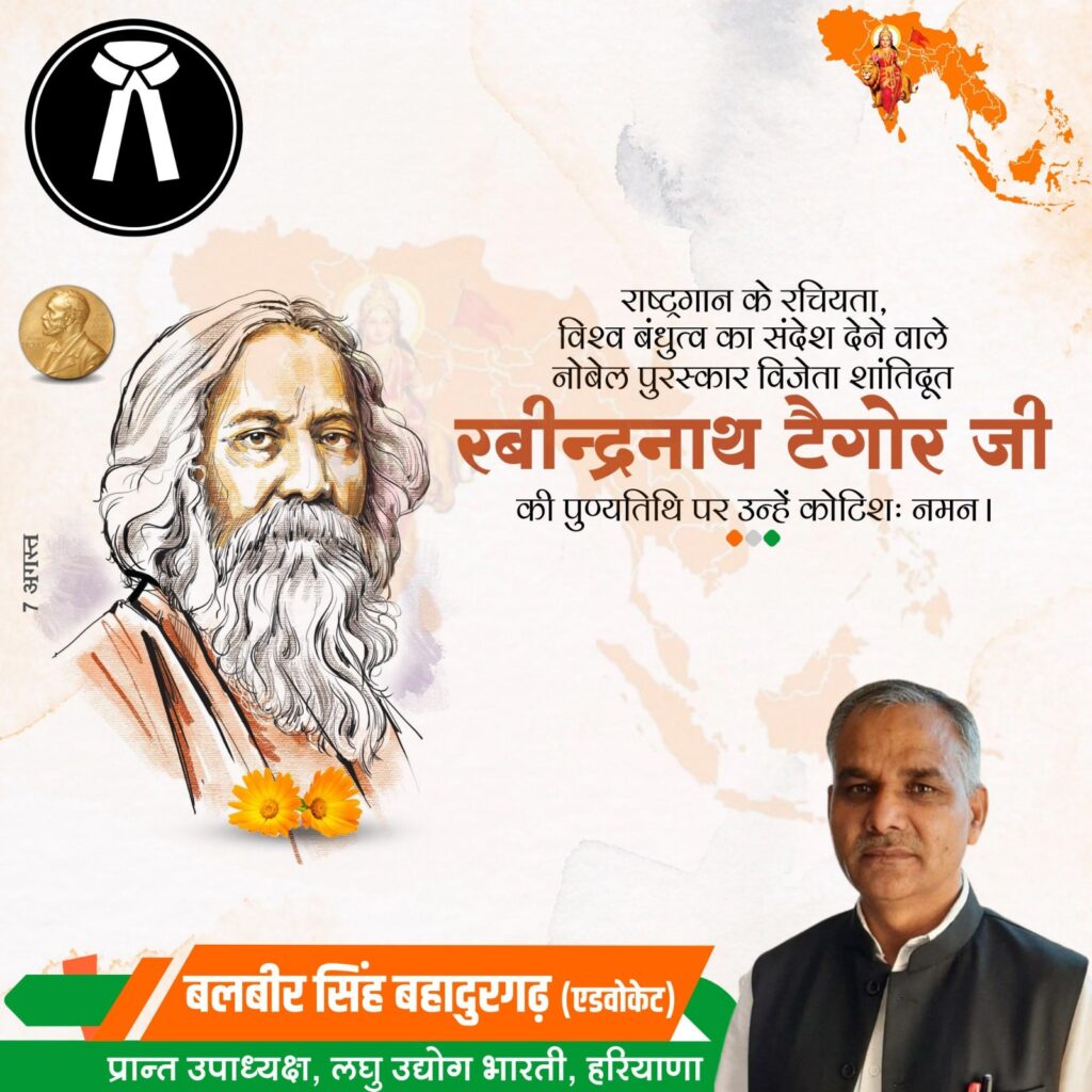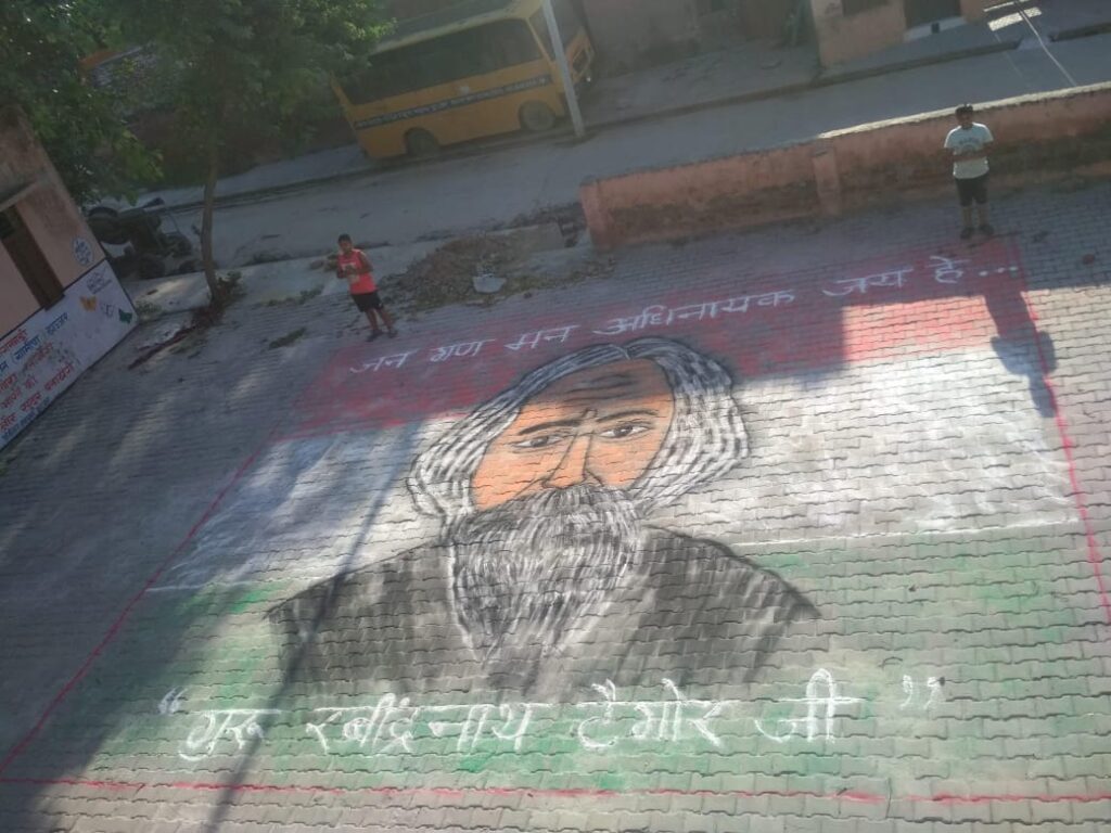 रविवार को गाँव भदाना की चौपाल में भूगोल प्राध्यापक मुकेश शर्मा व उनकी बेटी अंशुल शर्मा ने मिलकर गुरु रवींद्रनाथ टैगोर जी की पुण्यतिथि की पूर्व संध्या पर उनका विशाल रेखाचित्र उकेरा। 7 मई, 1861 को रवींद्रनाथ टैगोर जी का जन्म कोलकाता के सामान्य परिवार में हुआ था। वह एक विश्वविख्यात कवि, रचनाकार, चित्रकार व गीतकार थे। उनकों उनकी रचना गीतांजलि के लिए विश्व का सर्वश्रेष्ठ नोबल पुरस्कार मिला था। अंग्रेज अधिकारियों ने उन्होंने सर की उपाधि से सम्मानित किया था। वह महात्मा गांधी जी के जीवन से बहुत प्रभावित थे। सबसे पहले उन्होंने ही गांधी जी को माहात्मा के नाम से पुकारा था। उन्होंने भारत के राष्ट्रीय गान के साथ-साथ बांग्लादेश के राष्ट्रीय गान की भी रचना की थी। उनका निधन 7 अगस्त, 1941 को कोलकाता में हुआ था। सभी भारतीयों को उनके जीवन पर गर्व है। इस चौपाल रंगोली में पूर्व सैनिक देवीदत्त शर्मा, सूबेदार सुभाष शर्मा,रामवतार शर्मा, रमेश कौशिक, नशीब कौशिक, केशव शर्मा, अर्जुन शर्मा, अलीशा शर्मा आदि ने उपस्थित रहकर गुरु रवींद्रनाथ टैगोर जी को शत-शत नमन किया।