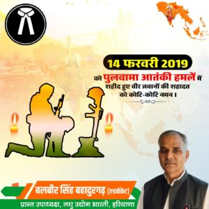 झज्जर, 13 फरवरी, अभीतक:- गाँव भदाना की चैपाल में भूगोल प्राध्यापक मुकेश शर्मा व उनकी बेटी अंशुल शर्मा ने मिलकर पुलवामा आतंकवादी हमले की वर्षगांठ की पूर्व संध्या पर भारतीय सैनिकों के सम्मान स्वरूप एक विशाल रेखाचित्र बनाया। 14 फरवरी, 2019 को एक कायराना आतंकवादी हमले में भारतीय सैनिक शहीद हो गए थे। सभी भारतीय इस कायराना आतंकवादी से काफी आघात हुए थे। 14 फरवरी को पूरे विश्व में वेलेंटाइन डे मनाया जाता है। इस रेखाचित्र का शीर्षक था वे मरे नहीं शहीद हुए हैं। साथ ही हैप्पी वेलेंटाइन डे टू इंडियन आर्मी रहा। सभी भारतीयों को अपने सैनिकों को गर्व है। इस चैपाल रंगोली में पूर्व सैनिक देवीदत्त शर्मा, सूबेदार सुभाष शर्मा, रमेश कौशिक, नन्दकिशोर शर्मा, वेदपाल कौशिक, अमन वशिष्ठ, राधेश्याम कौशिक, धीरज कौशिक, धीरज शर्मा, धनन्जय शर्मा, केशव शर्मा, सतीश कौशिक, सतपाल लाखवान, अर्जुन शर्मा, अलीशा शर्मा आदि ने उपस्थित रहकर पुलवामा शहीदों को अपना दिल से सलाम किया।