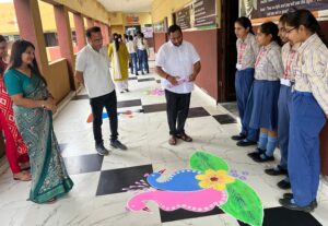 विजेता विद्यार्थियों के साथ अभाविप प्रांत सहमंत्री नवीन देशवाल। रंगोली व पेंटिंग को चैक करते हुए नवीन देशवाल।