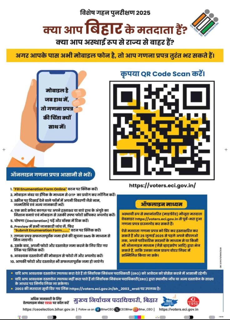 बिहार में मतदाता पुनरीक्षण अपडेट को लेकर प्रक्रिया जारी है। चुनाव आयोग वोटर लिस्ट से नाम काटने के पहले आयोग को नोटिस भेजेगा। एक अगस्त को प्रकाशित होने वाले प्रारूप में लोगों के नाम नहीं कटेंगे। उन्हें दस्तावेज देने का मौका मिलेगा। गणना प्रपत्र जमा करने वाले सभी मतदाताओं का नाम ड्राफ्ट में शामिल किया जाएगा।