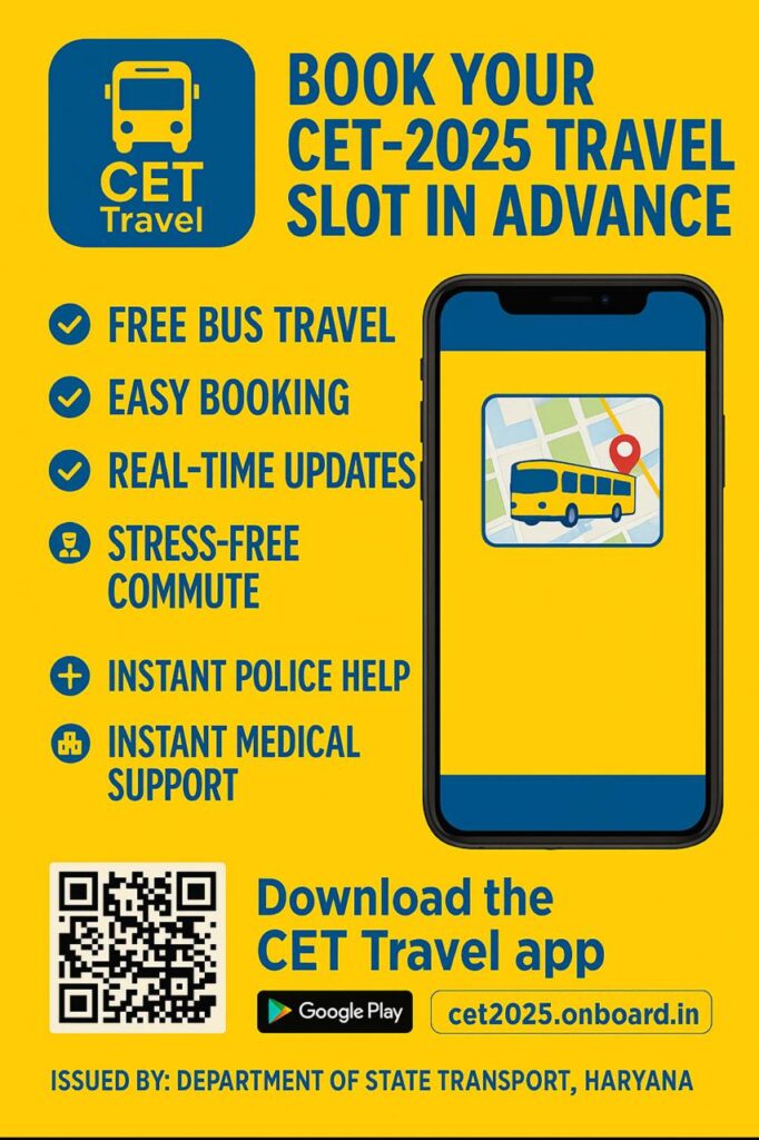 झज्जर, 21 जुलाई, अभीतक:- हरियाणा सरकार ने सीईटी -2025 परीक्षा में शामिल होने वाले छात्रों को मुफ्त बस यात्रा की सुविधा दी है। इसके लिए ष् सीईटी ट्रैवलष् नाम का मोबाइल ऐप लॉन्च किया गया है। छात्र इस ऐप की मदद से अपने यात्रा का समय और सीट पहले से बुक कर सकते हैं, ताकि परीक्षा के दिन उन्हें कोई परेशानी न हो। डीसी स्वप्लिन रवींद्र पाटिल ने बताया कि इस ऐप के जरिए छात्रों को फ्री, सुरक्षित और तनाव मुक्त यात्रा की सुविधा दी जा रही है। इस सुविधा के साथ ही झज्जर जिला में झज्जर, बहादुरगढ़ और बेरी के बस स्टैंड परिसरों में परीक्षार्थियों की सुविधा के लिए हेल्प डेस्क भी स्थापित किए गए हैं, जहां परीक्षार्थियों को मार्गदर्शन और सहायता प्रदान की जा रही है। डीसी ने बताया कि सीईटी परीक्षा केंद्र तक सुगम आवागमन के लिए इस ऐप पर अपनी यात्रा की जानकारी जरूर दर्ज करें। महिला अभ्यर्थी के साथ एक अन्य सदस्य को भी निशुल्क यात्रा की सुविधा दी जाएगी।