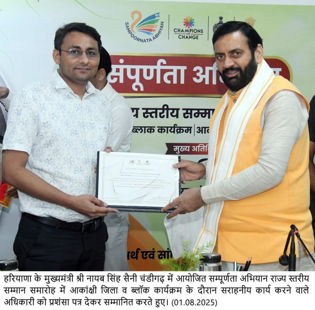 चण्डीगढ, 01 अगस्त, अभीतक:- हरियाणा के मुख्यमंत्री श्री नायब सिंह सैनी ने कहा कि प्रधानमंत्री श्री नरेंद्र मोदी का विजन देश के हर जिले और ब्लॉक में तेज व समावेशी विकास सुनिश्चित करना है। जो एक विशेष मिशन और जन आंदोलन है। यह मिशन हर नागरिक को सशक्त बनाने और यह सुनिश्चित करने के लिए प्रतिबद्ध है कि कोई भी जिला या ब्लॉक विकास के क्षेत्र में पिछे न रहे। मुख्यमंत्री श्री नायब सिंह सैनी ने यह बात आज हरियाणा निवास चण्डीगढ़ में आयोजित राज्य स्तरीय सम्पूर्णता अभियान सम्मान समारोह में आकांक्षी जिला एवं ब्लॉक कार्यक्रम के दौरान अधिकारियों व कर्मचारियों को सम्बोधित करते हुए कही। श्री नायब सिंह सैनी ने कहा कि प्रधानमंत्री श्री नरेंद्र मोदी के दूरदर्शी नेतृत्व में वर्ष 2018 में आकांक्षी जिला एवं ब्लॉक कार्यक्रम की शुरुआत हुई थी। इस कार्यक्रम में स्वास्थ्य और पोषण, शिक्षा, कृषि एवं जल संसाधन, वित्तीय सेवाएं और मूलभूत ढांचा जैसे प्रमुख क्षेत्रों पर ध्यान केंद्रित करना हैं। यह व्यापक दृष्टिकोण है, जिसमें हम सब मिलकर एक मजबूत, समृद्ध और समतापूर्ण भारत का निर्माण कर रहे हैं। उन्होंने कहा कि इस अभियान के परिणाम लोगों के सामने आने शुरू हो गए है। नीति आयोग द्वारा दिए गए विभिन्न क्षेत्रों के महत्वपूर्ण बिंदुओं पर सभी को मिलकर शत प्रतिशत कार्य करना है। ताकि इस अभियान के और अच्छे परिणाम जमीन स्तर पर मिल सके। उन्होंने कहा कि नीति आयोग के द्वारा पिछले दिए गए बिंदुओं पर स्वामित्व बनाए रखना जरूरी है। इस अभियान के तहत प्रधानमंत्री के सपनों और लोगों की अपेक्षाओं को पूरा करने का कार्य कर रहे है। मुख्यमंत्री ने कहा कि आकांक्षी जिला व ब्लॉक कार्यक्रम के तहत नीति आयोग द्वारा दिए गए विभिन्न क्षेत्रों में लक्ष्य को पूरा करने के उपरांत उस कार्य की रिपोर्ट लेकर वेरिफिकेशन करवाई जाए। ताकि कार्यक्रम के तहत धरातल पर हुए कार्य के बारे में पूर्ण और सटीक जानकारी प्राप्त हो सकें। उन्होंने कहा कि प्रधानमंत्री श्री नरेंद्र मोदी द्वारा शुरू किए गए इस अभियान के बाद आज मेवात में इसके सकारात्मक परिणाम मिल रहे है। उन्होंने अधिकारियों व कर्मचारियों को यह भी निर्देश दिया कि नीति आयोग द्वारा हर वर्ष जो लक्ष्य इन जिलों के ब्लॉक के लिए दिया जाता है उस लक्ष्य को समय पर शत प्रतिशत हासिल करना है। अच्छे कार्य के लिए उन्होंने अधिकारियों व कर्मचारियों को बधाई भी दी है। श्री नायब सिंह सैनी ने अधिकारियों को निर्देश देेत हुए कहा कि इन जिलों में किसानों को बागवानी की तरफ बढ़ाया जाए और बागवानी के नए-नए विकल्प दिए जाए। इसके अलावा, उन्होंने कहा कि सायॅल हेल्थ कार्ड का सरलीकरण कर किसानों को इसकी पूरी जानकारी दी जाए। उन्होंनेे कृष