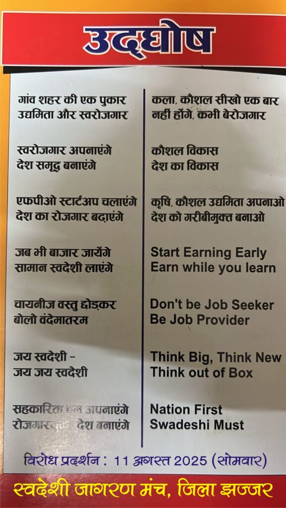उन्होंने कहा कि स्वदेशी जागरण मंच देश के प्रत्येक नागरिक से स्वदेशी सुरक्षा एवं स्वावलंबन अभियान का हिस्सा बनने का आह्वान करता है, जिसका एकमात्र उद्देश्य हमारे भारत को फिर से महान बनाना है। इस अवसर पर जिला संयोजक मनमोहन खंडेलवाल, जिला टोली सदस्य श्री नविन्द्र कुमार, नगर सहसंयोजक सुरेन्द्र सिंह, प्रचार प्रमुख कमल कुमार आदि उपस्थित रहे।