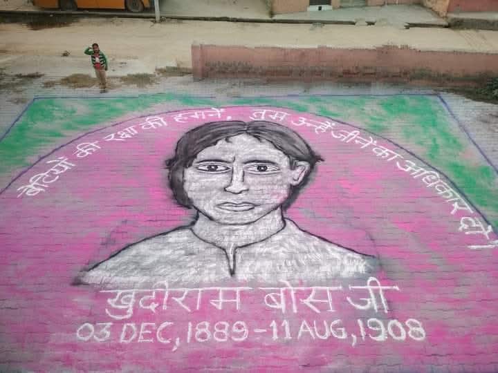 झज्जर, 11 अगस्त, अभीतक: गाँव भदाना की चैपाल में भूगोल प्राध्यापक मुकेश शर्मा व उनकी बेटी अंशुल शर्मा ने मिलकर भारतवर्ष के युवा क्रांतिकारी खुदीराम बोस के शहीदी दिवस पर उनका एक रेखाचित्र बनाया। इस रेखाचित्र का शीर्षक था बेटियों की रक्षा की हमनें,तुम उन्हें जीने का अधिकार दो। भारतवर्ष की आजादी के लिए इस युवा क्रन्तिकारी ने 17 वर्ष की आयु में ही फांसी के फंदे को चूम लिया था। खुदीराम बोस एक स्वतंत्रता संग्राम सेनानी थे, जिन्हें भारतीय स्वतंत्रता संग्राम के सबसे युवा क्रांतिकारियों में से एक के तौर पर जाना जाता है। उनका जन्म 3 दिसंबर 1889 को हुआ था। उनके पिता त्रैलोक्यनाथ बसु शहर के तहसीलदार थे और मां लक्ष्मीप्रिया देवी एक धर्मनिष्ठ महिला। उनका जन्म पश्चिम बंगाल के मेदिनिपुर जिले के बहुवैनी में हुआ था। खुदीराम बोस पर भगवद गीता के कर्म अध्याय का गहरा असर था। वह भारत माता को अंग्रेजों की दासता से मुक्त कराने के लिए क्रांतिकारी गतिविधियों में शामिल हो गए थे। 1905 में बंगाल के विभाजन की नीति से असंतुष्ट होकर उन्होंने जुगांतर की सदस्यता ले ली थी। यह संगठन क्रांतिकारी गतिविधियों को अंजाम देता था। 16 साल के किशोर वय में बोस ने पुलिस स्टेशन के पास बम फेंके और सरकारी अधिकारियों को निशाना बनाया। सिलसिलेवार बम धमाकों के सिलसिले में उन्हें गिरफ्तार किया गया था। मुजफ्फरपुर, बिहार में 30 अप्रैल 1908 को खुदीराम बोस और प्रफुल्ल चाकी ने चीफ प्रेजिडेंसी मजिस्ट्रेट किंग्सफोर्ड की हत्या की योजना बनाई थी। ऐसा माना जाता था कि मजिस्ट्रेट क्रांतिकारियों और स्वतंत्रता संग्राम सेनानियों के खिलाफ ही फैसला सुनाता है। बोस और चाकी ने किंग्सफोर्ड की बग्गी का यूरोपीय क्लब के गेट के सामने आने तक इंतजार किया। फिर उसे उड़ा दिया। लेकिन उसमें किंग्सफोर्ड नहीं था। उसके बजाय मिसेस कैनेडी और उनकी बेटी उसमें सवार थी, जिसकी हादसे में मौत हो गई थी। दोनों क्रांतिकारी उस जगह से भाग निकले थे। बाद में प्रफुल्ल ने तो आत्महत्या कर ली थी, जबकि खुदीराम गिरफ्तार हो गए थे। बम धमाकों के आरोप में खुदीराम बोस को 19 वर्ष की उम्र में फांसी की सजा सुनाई गई थी। उन्हें 11 अगस्त 1908 को फांसी पर चढ़ाया दिया था। इस चैपाल रंगोली में भूतपूर्व सैनिक देवीदत्त शर्मा, सूबेदार सुभाष शर्मा, रामवतार शर्मा, मास्टर वेदप्रकाश शर्मा, अनिल कौशिक, राधेश्याम कौशिक, रुद्र कौशिक, मास्टर सन्दीप कौशिक, रमेश कौशिक, नशीब कौशिक, केशव शर्मा, अर्जुन शर्मा, अलीशा शर्मा ने मिलकर महान क्रांतिकारी खुदीराम बोस को सलाम किया।