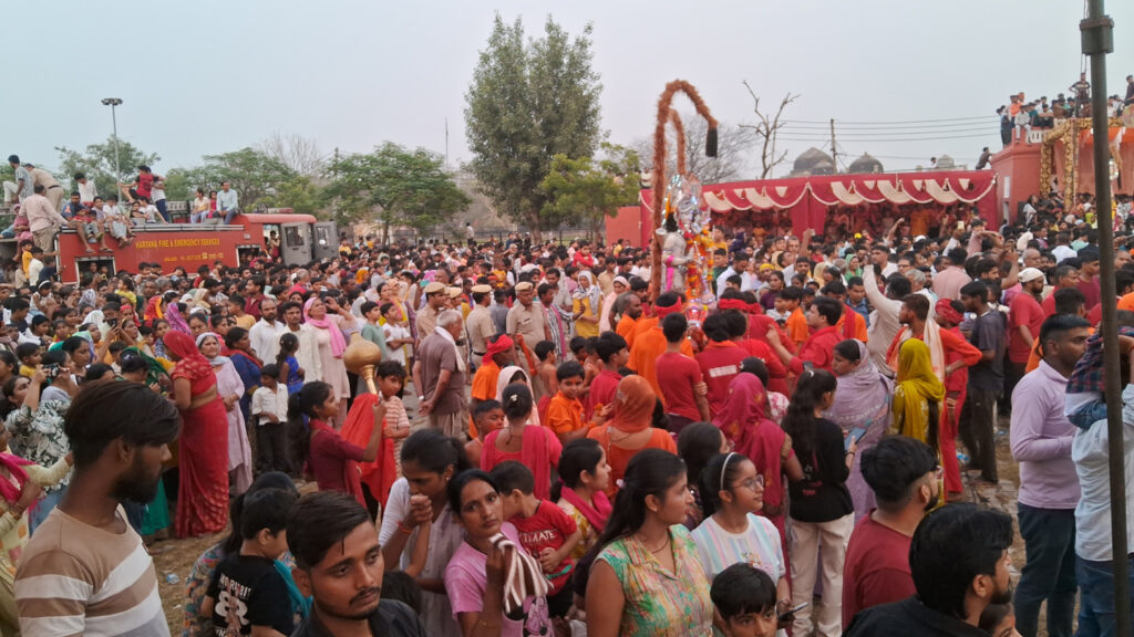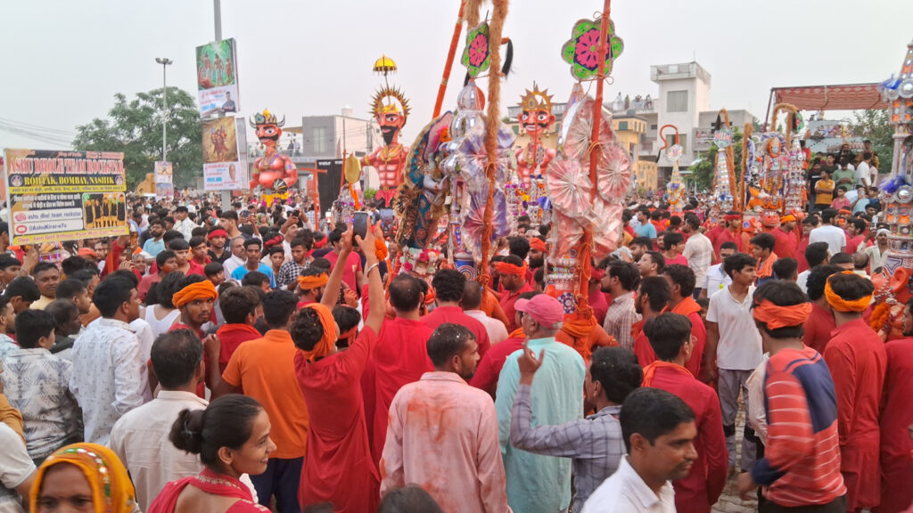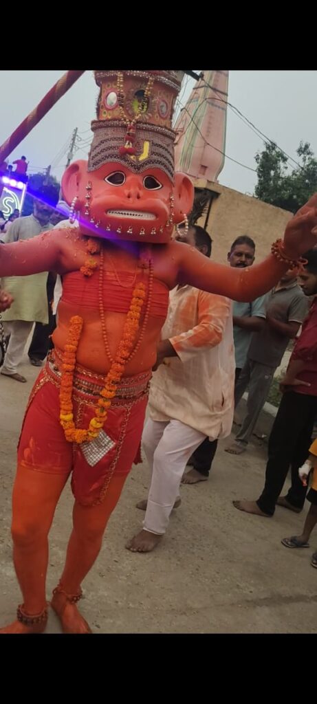 विभिन्न क्षेत्रों से काफी संख्या में आए सिंदूरी मुक्टधारी हनुमान जमकर नाचे