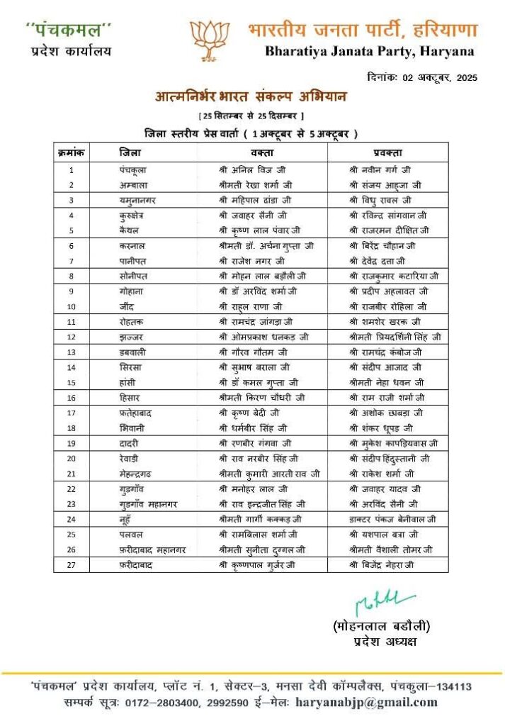 प्रदेश अध्यक्ष श्री मोहन लाल बड़ौली ने आत्मनिर्भर भारत संकल्प अभियान की प्रेस कॉन्फ्रेंस हेतु जिला वक्ता एवं प्रवक्ताओं की नियुक्ति की है, जिसकी सूची निम्नलिखित है।