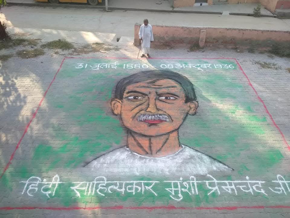 हिंदी साहित्यकार मुंशी प्रेमचंद की पुण्यतिथि पर रंगोली रेखाचित्र बनाकर श्रद्धांजलि प्रदान की