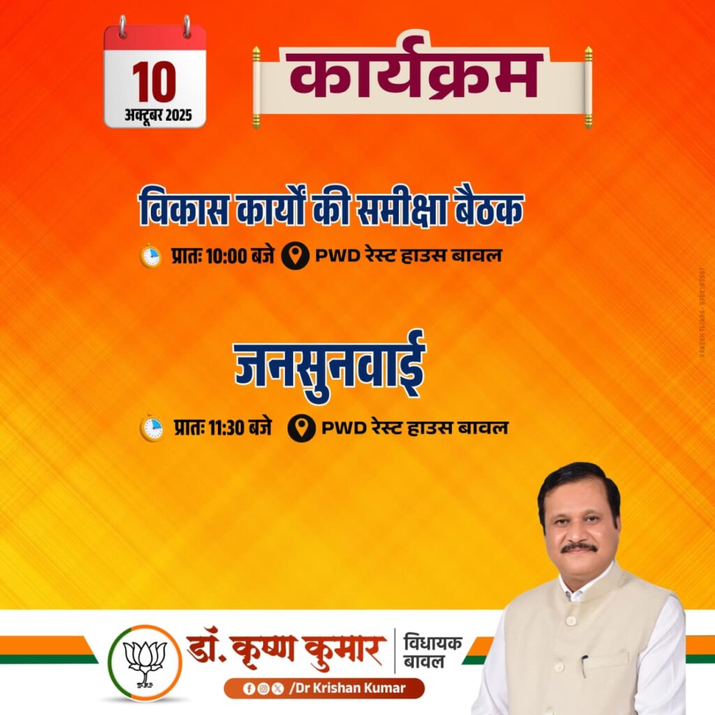 रेवाड़ी, 09 अक्तूबर, अभीतक: बावल के विधायक डॉ. कृष्ण कुमार 10 अक्तूबर दिन शुक्रवार को सुबह 10 बजे बावल स्थित लोक निर्माण विभाग के विश्राम गृह में विकास कार्यों की समीक्षा बैठक करेंगे। बैठक में सभी विभागों के अधिकारी और कर्मचारी भाग लेंगे। बैठक के उपरांत सुबह 11ः30 बजे जनसमस्याएं सुनकर समाधान करवाएंगे।