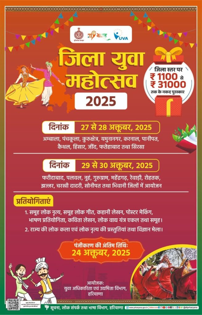 रेवाड़ी, 12 अक्तूबर, अभीतक: युवा अधिकारिता एवं उद्यमिता विभाग हरियाणा द्वारा जिला युवा महोत्सव-2025 का आयोजन 29 व 30 अक्टूबर को किया जाएगा। पंजीकरण की अंतिम तिथि 24 अक्टूबर है। डीसी अभिषेक मीणा ने जानकारी देते हुए बताया कि जिला युवा महोत्सव में विभिन्न प्रतियोगिताएं आयोजित की जाएगी, जिसमें समूह लोक नृत्य, समूह लोक गीत, कहानी लेखन, पोस्टर मेकिंग, भाषण प्रतियोगिता, कविता लेखन, लोक वाद्य यंत्र एकल तथा समूह प्रतियोगिताएं होंगी। वहीं राज्य की लोक कला एवं लोक नृत्य की प्रस्तुतियों के साथ विज्ञान मेला का भी आयोजन किया जाएगा। डीसी ने बताया कि जिला युवा महोत्सव में आवेदन करने की अंतिम तिथि 24 अक्टूबर है। इसमें प्रतिभागियों की आयु 1 सितंबर 2025 को 15 से 29 वर्ष होनी चाहिए। सभी प्रतियोगिताओं में भाग लेने वाले प्रतिभागियों का माई भारत पोर्टल पर पंजीकरण होना अनिवार्य है। एक प्रतिभागी केवल एक ही प्रतियोगिता में भाग ले सकता है। जिला स्तर पर विजेताओं को प्रमाण पत्र व पुरस्कार राशि भी दी जाएगी। उन्होंने बताया कि जिला स्तर पर प्रथम, द्वितीय और तृतीय स्थान प्राप्त करने वाले चयनित प्रतिभागी राज्य स्तरीय युवा महोत्सव में भाग लेंगे। जिला स्तरीय युवा महोत्सव में विजेताओं को 1100 रुपए से 31 हजार रूपए तक के नकद पुरस्कार दिए जाएंगें।