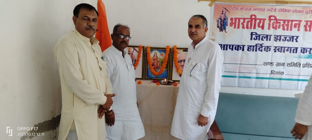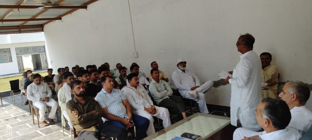 भारतीय किसान संघ मातनहेल खंड में ग्राम समितियों का प्रशिक्षण वर्ग खंड अध्यक्ष राजपाल बम्बुलिया की अध्यक्षता में सम्पन्न बहादुरगढ़, 12 अक्तूबर, अभीतक: भारतीय किसान संघ झज्जर के मातनहेल खंड में ग्राम समितियों का प्रशिक्षण वर्ग खंड अध्यक्ष राजपाल बम्बुलिया की अध्यक्षता में सम्पन्न हुआ। प्रशिक्षण वर्ग में उपस्थित प्रदेश अध्यक्ष सतीश छिकारा, संभाग संगठन मंत्री मोहिंदर, जिला अध्यक्ष धर्मवीर गुलिया ने अपने विचार रखे। जिला अध्यक्ष धर्मवीर गुलिया ने जिले की तरफ से सभी का स्वागत किया। जिले के सभी खंडों में संगठन के कार्य के बारे विस्तार से बताया और उपस्थित कार्यकर्ताओं को जायदा से ज्यादा ग्राम समितियों से जुड़ने बारे आग्रह किया। संभाग संगठन मंत्री मोहिंदर सिंह ने संगठन की रीति नीति बारे सभी को बताया कि भारतीय किसान संघ दुनिया का सबसे बड़ा राष्ट्रवादी, गैर राजनीतिक,निस्वार्थ किसानों का किसानों के लिए संगठन है। जो किसानों के लिए संगठनात्मक, रचनात्मक व आंदोलनात्मक कार्य करता है। प्रदेश अध्यक्ष सतीश छिकारा ने ग्राम समितियों के गठन ओर उनके दायित्वों के बारे बताया कि भारतीय किसान संघ की स्थापना 4 मार्च, 1979 को राजस्थान के कोटा जिले में परम श्रद्धेय दत्तोपंत ठेंगड़ी जी द्वारा भारत के किसानों की आवाज को समान रूप से पूरे देश के लिए उठाने के लिए किया। उन्होंने बताया कि भारतीय किसान संघ के मुख्य चार उत्सव मनाएं जाते हैं भारत माता पूजन कार्यक्रम,स्थापना दिवस,भगवान बलराम जयंती,गोपाष्टमी यानि गौ पूजन इन सभी की किसानों के लिए महत्वता ओर विधि के बारे विस्तार से बताया। पंच परिवर्तन के पांचों विषयों, कुटुम्ब प्रबोधन,सामाजिक सदभाव,स्वदेशी जीवन,नागरिक अनुशासन एवं पर्यावरण के विषयों को अपने जीवन में शामिल करके किस तरह हम समाज में व्यवस्था परिवर्तन ला सकते हैं। जहर मुक्त खेती, नशा मुक्त गांव के नारे को साथ रखते हुए गौ आधारित जैविक खेती करने के लिए किसानों को प्रेरित किया। इस मौके पर भारतीय किसान संघ हरियाणा के कार्यकारिणी सदस्य सत्यवीर आर्य,जिला उपाध्यक्ष रविंद्र धनखड़, ग्राम विकास संयोजक मनोज कुमार, आजेंद्र सिंह, मोनू यादव, अशोक कुमार खंड मंत्री, संदीप गोरिया खंड उपाध्यक्ष, तकदीर सिंह, रमेश कुमार, हरिचन्द्र, परवीन कुमार, आनंद सिंह, राजबीर सिंह, मोहित छिल्लर, जयपाल सिंह, आशु देव, सुनील कुमार, संजय चैहान, वीरेंद्र सिंह, मस्ताना, पवन, अजय, कुलदीप जांगड़ा, सतबीर सिंह, पवन कुमार, संदीप, रतिराम, सोमबीर, सोनू, पंकज, अनिल कुमार, सूरजभान आर्य, चरणसिंह आदि किसान प्रतिनिधि मौजूद रहे।