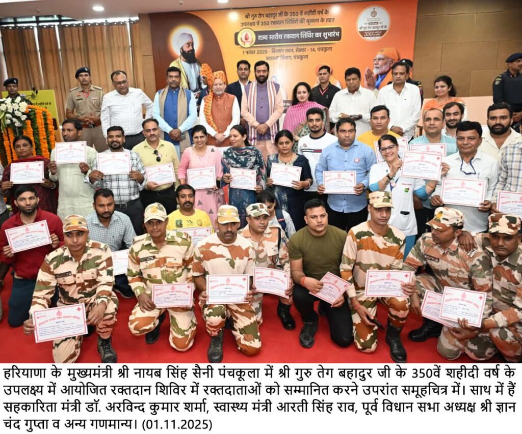 चण्डीगढ, 01 नवम्बर, अभीतक: हरियाणा के मुख्यमंत्री श्री नायब सिंह सैनी ने कहा कि रक्तदान महादान है और मानवता की सच्ची सेवा है। प्रदेश के लोग विभिन्न अवसरों पर रक्तदान कर रहे हैं और जब कोई विशेष दिवस रक्तदान जैसे पुण्य कार्यों के साथ मनाया जाता है, तो उसका सामाजिक मूल्य और आध्यात्मिक पुण्य कई गुणा बढ़ जाता है। मुख्यमंत्री आज किसान भवन, सेक्टर 14, पंचकूला में श्री गुरु तेग बहादुर जी के 350वें शहीदी दिवस के उपलक्ष्य में आयोजित राज्य स्तरीय रक्तदान शिविर का शुभारम्भ करने उपरांत सम्बोधित कर रहे थे। उन्होंने प्रदेशवासियों को हरियाणा दिवस की शुभकामनाएं देते हुए कहा कि आज का दिन हरियाणा के निर्माण का उत्सव और श्री गुरु तेग बहादुर जी के बलिदान से प्रेरणा लेने का दिन है। इससे पहले मुख्यमंत्री ने रक्तदान शिविर मेें रक्तदाताओं को बैज लगाकर उनका हौसला बढ़ाया और इस पुनीत कार्य के लिए उन्हें बधाई एवं शुभकामनाएं भी दी। इस अवसर पर स्वास्थ्य मंत्री आरती सिंह राव और सहकारिता मंत्री डा0 अरविंद शर्मा भी उपस्थित थे। मुख्यमंत्री श्री नायब सिंह सैनी ने कहा कि इस रक्तदान शिविर का आयोजन श्री गुरु तेग बहादुर जी को हमारी सच्ची श्रद्धांजलि है। उनका जीवन हमें यह सिखाता है कि धर्म की रक्षा केवल तलवार से नहीं, बल्कि त्याग और सत्य से होती है। जब औरंगजेब के अत्याचार से भारत की आत्मा कराह रही थी, जब धर्म परिवर्तन के लिए लोगों को मजबूर किया जा रहा था, तब श्री गुरु तेग बहादुर जी ने कहा था ‘सीस दिया पर धर्म न दिया। उनका यह बलिदान किसी एक समुदाय के लिए नहीं था। वह समस्त मानवता की स्वतंत्रता, धार्मिक आस्था और अभिव्यक्ति की आजादी के लिए था। उन्होंने कहा कि आज, श्री तेग बहादुर जी के शहीदी दिवस के उपलक्ष्य में जब हम रक्तदान कर रहे हैं, तो यह केवल किसी को जीवन दान देने तक सीमित नहीं है, बल्कि गुरु जी के संदेश का सबसे बड़ा पालन है। गुरु जी ने हमें दूसरों के लिए अपना जीवन न्यौछावर करने का पाठ पढ़ाया था। आज हम अपना रक्त देकर उसी परोपकार की परंपरा को आगे बढ़ा रहे हैं। रक्तदान, जीवनदान है और जीवनदान से बड़ा कोई धर्म, कोई सेवा, कोई उपासना नहीं है। श्री नायब सिंह सैनी ने कहा कि रक्तदान से किसी मरीज को नया जीवन मिलता है। वह सदा रक्तदाता का आभारी रहता है। विज्ञान चाहे आज नित नई प्रगति कर रहा है। लेकिन अभी तक विज्ञान रक्त का कोई विकल्प नहीं ढूंढ पाया है। रक्त को बनाया नहीं जा सकता, केवल दान से प्राप्त रक्त से ही किसी की जिंदगी बचाई जा सकती है। उन्होंने कहा कि जब आप रक्तदान करते हैं, तो आप न केवल किसी एक व्यक्ति के जीवन को बचाते हैं, बल्कि एक पूरे परिवार को संकट से उबारते हैं। इसलिए आज हम सभी को यह समझना होगा कि रक्तदान एक सामाजिक जिम्मेदारी 