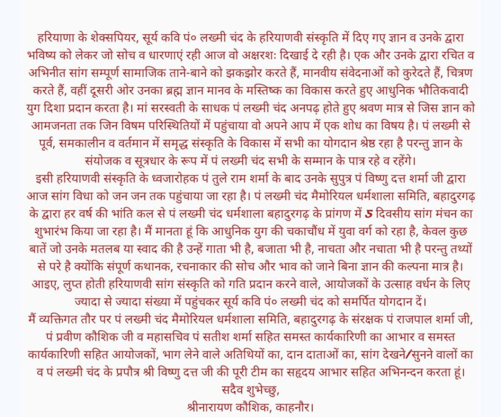 हरियाणा के शेक्सपियर, सूर्य कवि पं० लख्मी चंद के हरियाणवी संस्कृति में दिए गए ज्ञान व उनके द्वारा भविष्य को लेकर जो सोच व धारणाएं रही आज वो अक्षरशः दिखाई दे रही है। एक और उनके द्वारा रचित व अभिनीत सांग सम्पूर्ण सामाजिक ताने-बाने को झकझोर करते हैं, मानवीय संवेदनाओं को कुरेदते हैं, चित्रण करते हैं, वहीं दूसरी ओर उनका ब्रह्म ज्ञान मानव के मस्तिष्क का विकास करते हुए आधुनिक भौतिकवादी युग दिशा प्रदान करता है। मां सरस्वती के साधक पं लख्मी चंद अनपढ़ होते हुए श्रवण मात्र से जिस ज्ञान को आमजनता तक जिन विषम परिस्थितियों में पहुंचाया वो अपने आप में एक शोध का विषय है। पं लख्मी से पूर्व, समकालीन व वर्तमान में समृद्ध संस्कृति के विकास में सभी का योगदान श्रेष्ठ रहा है परन्तु ज्ञान के संयोजक व सूत्रधार के रूप में पं लख्मी चंद सभी के सम्मान के पात्र रहे व रहेंगे। इसी हरियाणवी संस्कृति के ध्वजारोहक पं तुले राम शर्मा के बाद उनके सुपुत्र पं विष्णु दत्त शर्मा जी द्वारा आज सांग विधा को जन जन तक पहुंचाया जा रहा है। पं लख्मी चंद मैमोरियल धर्मशाला समिति, बहादुरगढ़ के द्वारा हर वर्ष की भांति कल से पं लख्मी चंद धर्मशाला बहादुरगढ़ के प्रांगण में 5 दिवसीय सांग मंचन का शुभारंभ किया जा रहा है। मैं मानता हूं कि आधुनिक युग की चकाचैंध में युवा वर्ग को रहा है, केवल कुछ बातें जो उनके मतलब या स्वाद की है उन्हें गाता भी है, बजाता भी है, नाचता और नचाता भी है परन्तु तथ्यों से परे है क्योंकि संपूर्ण कथानक, रचनाकार की सोच और भाव को जाने बिना ज्ञान की कल्पना मात्र है। आइए, लुप्त होती हरियाणवी सांग संस्कृति को गति प्रदान करने वाले, आयोजकों के उत्साह वर्धन के लिए ज्यादा से ज्यादा संख्या में पहुंचकर सूर्य कवि पं० लख्मी चंद को समर्पित योगदान दें।