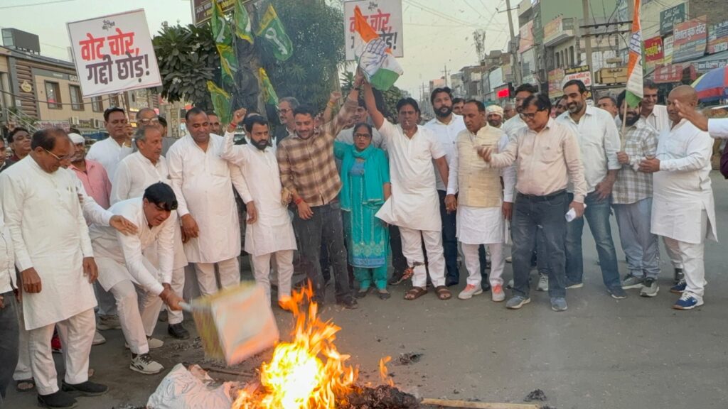 वोट चोरी को लेकर कांग्रेस नेताओं व कार्यकत्र्ताओं ने जलाया चुनाव आयोग व भाजपा का पुतला