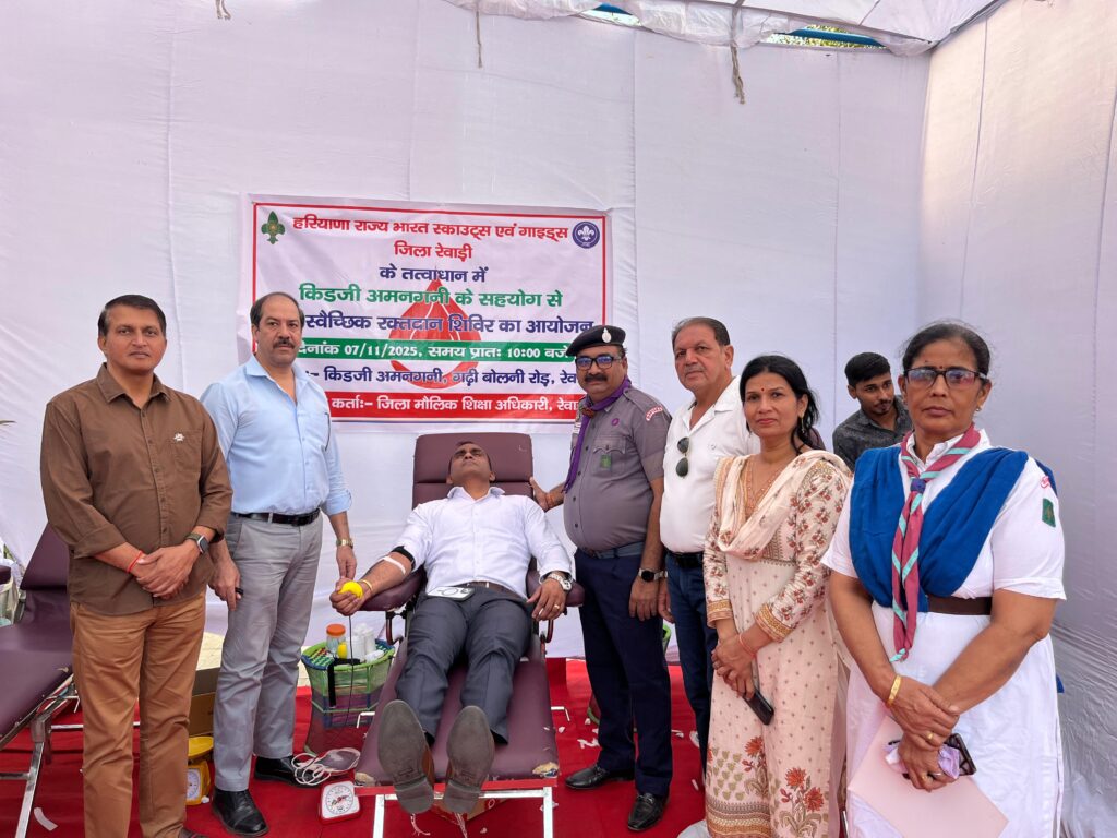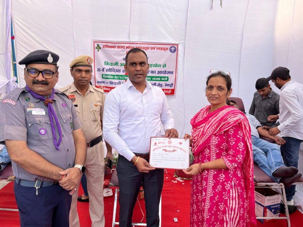 रेवाड़ी, 07 नवम्बर, अभीतक: हरियाणा राज्य भारत स्काउट्स एवं गाइड्स जिला की कब बुलबुल शाखा द्वारा शुक्रवार को 25वें स्वैच्छिक रक्तदान शिविर का आयोजन किया गया। इस शिविर का शुभारंभ नगराधीश जितेंद्र कुमार द्वारा किया गया। रक्तदान शिविर में 10 महिलाओं सहित कुल 67 यूनिट रक्त एकत्र किया गया। शिविर का आयोजन किड्जी स्कूल अमंगनी सोसाइटी रेवाड़ी में किया गया। रक्तदान शिविर में नगराधीश द्वारा रक्तदाताओं को प्रमाण पत्र प्रदान कर एवं स्वयं भी रक्तदान कर रक्तदाताओं को प्रोत्साहित किया गया। इस शिविर में आयोजनकर्ता अमित कुमार द्वारा अपने पूरे परिवार के साथ रक्तदान किया, जिसमें ईशान द्वारा 18 वर्ष के होने उपरांत पहली बार रक्तदान किया गया। इस शिविर के आयोजन में किड्जी स्कूल का अभूतपूर्व योगदान रहा।