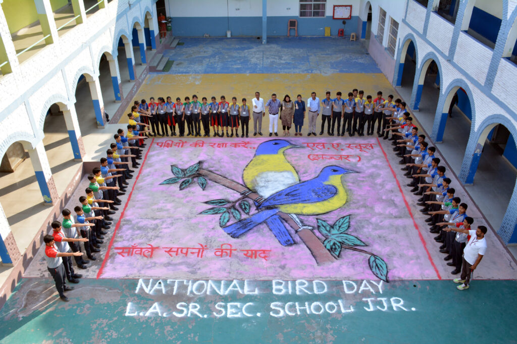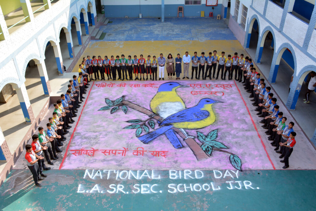 एल.ए. स्कूल में नेशनल बर्ड डे के अवसर पर विशाल रंगोली से दिया पक्षियों की रक्षा का संदेश