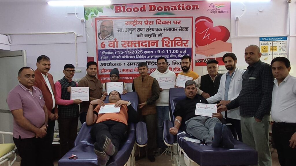 भिवानी, 15 नवंबर, अभीतक:- राष्ट्रीय प्रेस दिवस के उपलक्ष्य में पत्रकारिता और रंगमंच के प्रति समर्पित रहे स्व. पत्रकार एवं रंगकर्मी अनुज राणा की पुण्य स्मृति में एक भावभीनी पहल की गई। सहारा चैरिटेबल ट्रस्ट भिवानी एवं भिवानी मीडिया के संयुक्त तत्वावधान में शनिवार को सहारा चेरिटेबल ट्रस्ट द्वारा स्थानीय चै. बंसीलाल नागरिक अस्पताल के ब्लड बैंक में रक्तदान शिविर का आयोजन किया गया। कार्यक्रम में अनुज राणा के पिता सोम प्रकाश आर्य मुख्य रूप से शामिल हुए। इस दौरान 44लोगों ने रक्तदान कर स्व. पत्रकार अनुज राणा को श्रद्धांजलि दी। शिविर का शुभारंभ जिला सूचना एवं जनसंपर्क अधिकारी सुरेन्द्र सिंगल और स्व. पत्रकार अनुज राणा के पिता डा. सोमप्रकाश आर्य और चेरिटेबल ट्रस्ट के अध्यक्ष रातदताओं बैज लगाकर उनका हौसला बढ़ाया। ने रक्तदान शिविर का शुभारंभ किया। सिविल सर्जन डा. रघुबीर शांडिल्य और प्रधान चिकित्सा अधिकारी डा. राज दिसोदिया उपस्थित रहे। इस अवसर पर रक्तदान प्रभारी डा. रोहित कुमार, डा. मनीष श्योरण, डा. यतिन गुप्ता, डा. गोपाल शर्मा और डा. बलवान सिंह भी मौजूद रहे, जिन्होंने रक्तदान के महत्व पर प्रकाश डाला। इस अवसर पर डीआईपीआरओ सुरेन्द्र सिंगल व स्व. अनुज राणा के पिता डा. सोमप्रकाश आर्य ने कहा कि पत्रकारिता को लोकतंत्र का चैथा स्तंभ कहा जाता है और एक पत्रकार का जीवन समाज को जागरूक करने में समर्पित होता है। उन्होंने स्व. अनुज राणा को श्रद्धांजलि देते हुए कहा कि उनकी स्मृति में रक्तदान शिविर का आयोजन करना, उनकी सामाजिक प्रतिबद्धता को आगे बढ़ाना है। उन्होंने कहा कि पत्रकार अनुज राणा ने अपनी कलम और रंगमंच के माध्यम से समाज को दिशा देने का काम किया। रक्तदान उनके जीवन मूल्यों का सच्चा प्रतीक है। इस मौके पर सीएमओ डा. रघुबीर शांडिल्य व पीएमओ डा. राज दिसोदिया ने शिविर की सराहना करते हुए कहा कि रक्त की उपलब्धता जीवन-रक्षक के लिए अत्यंत आवश्यक है और ऐसे शिविर ब्लड बैंक को मजबूत करते हैं। उन्होंने कहा कि रक्तदान शिविर ना केवल अनुज राणा को एक नेक श्रद्धांजलि है, बल्कि यह संदेश भी देता है कि समाज का हर वर्ग स्वास्थ्य सेवाओं को सुदृढ़ करने में अपना योगदान दे सकता है। इस मौके पर शतकवीर रक्तदाता राजेश डुडेजा व रक्तवीर मनीष वर्मा स्व. पत्रकार अनुज राणा ने हमेशा दूसरों के लिए जिया। उसकी याद में रक्त के रूप में जीवन दान देना, उसके विचारों और कर्मों को अमर बनाता है। इस अवसर पर कुलदीप भारद्वाज, अनिल बजाज, अशोक शर्मा फोटोग्राफर, अंकित ठाकुर, कल्लू भट्ट, इंद्रवेश दुहन, सोमबीर शर्मा, संजय फोजी, मास्टर बलवान, मुकेश मेहता, बृजेश, विजय मिताथल, अधिकार मित्र राजेश बिष्ट, स्टाफ नर्स सुमन व गुंजन, लैब टेक्नीशियन कृष्णा सां
