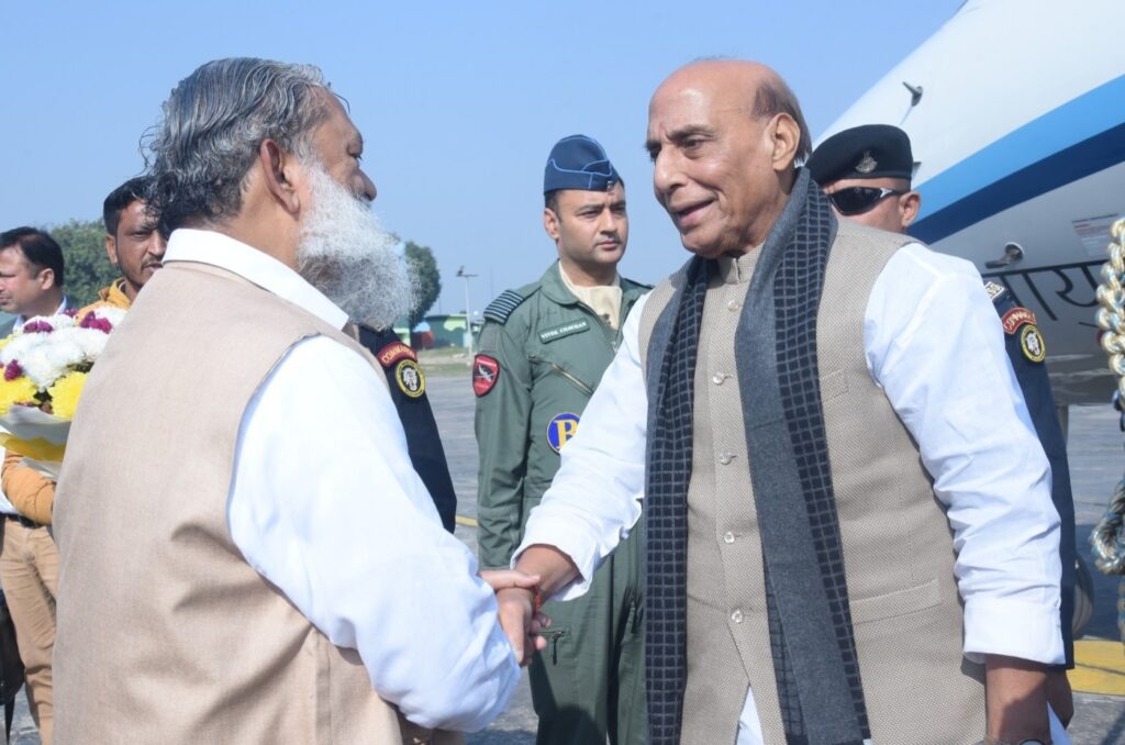 रक्षामंत्री राजनाथ सिंह का ऊर्जा मंत्री अनिल विज ने अम्बाला एयरफोर्स स्टेशन पर स्वागत किया’