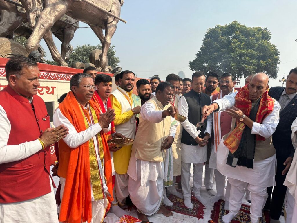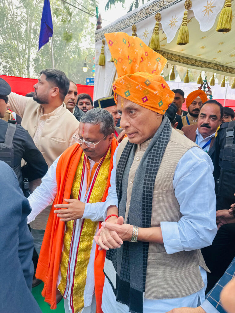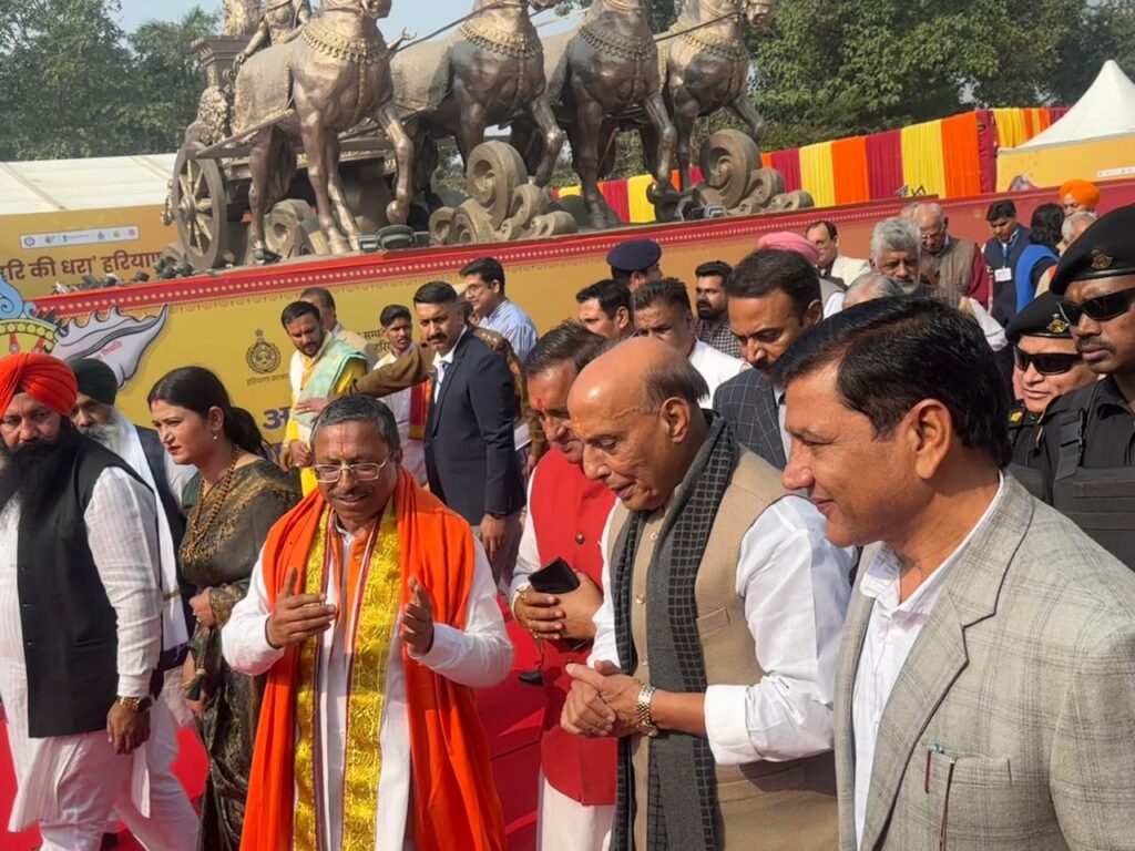 चंडीगढ़, 24 नवंबर, अभीतक:- देश के यशस्वी रक्षामंत्री श्री राजनाथ सिंह का आज प्रातरू अम्बाला छावनी एयरफोर्स स्टेशन आगमन पर हरियाणा के ऊर्जा, परिवहन एवं श्रम मंत्री श्री अनिल विज ने गर्मजोशी से स्वागत व अभिनंदन किया। रक्षामंत्री राजनाथ सिंह प्रातः दिल्ली से विशेष विमान से अम्बाला छावनी एयरफोर्स स्टेशन पहुंचे, जहां ऊर्जा मंत्री अनिल विज के अलावा मंडल आयुक्त, उपायुक्त, पुलिस अधीक्षक सहित सेना और वायुसेना के वरिष्ठ अधिकारियों ने उनका स्वागत किया। इसके उपरांत रक्षामंत्री राजनाथ सिंह तथा ऊर्जा मंत्री अनिल विज भारतीय वायुसेना के एमआई- 17 हेलीकॉप्टर में अम्बाला से कुरुक्षेत्र के लिए रवाना हुए। गौरतलब है कि रक्षा मंत्री राजनाथ सिंह आज कुरुक्षेत्र में अंतरराष्ट्रीय गीता महोत्सव में हिस्सा लेने तथा गीता पूजन के साथ सहभागी राज्य मध्य प्रदेश व हरियाणा के पवेलियन का उद्घाटन करेंगे।