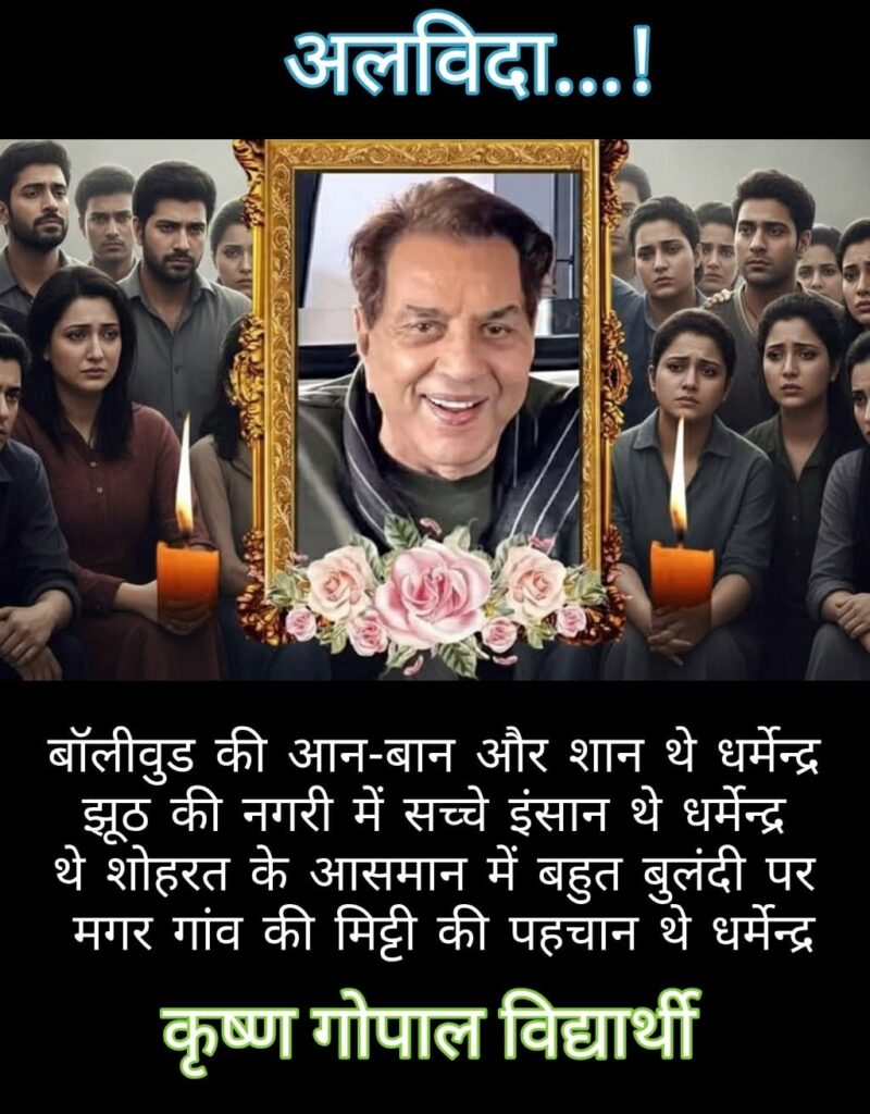भाजपा के राष्ट्रीय सचिव औमप्रकाश धनखड़ ने हिन्दी व पंजाबी फिल्मों के सुप्रसिद्ध सुपर स्टार रहे धर्मेंद्र के निधन पर शोक प्रकट किया है। उन्होंने कहा कि धमेंद्र के निधन के समाचार से पूरे देश में गमगीन माहौल है। उन्होंने अभिनय के दम पर भारतीय सिनेमा को नई उचाइयों पर पंहुचाया। उनके अनेक किरदार आने वाली पीढियों तक याद किए जाएंगे। धनखड़ ने दिवंगत आत्मा को नमन किया और परमपिता परमात्मा से अपने श्री चरणों स्थान देने की प्रार्थना की।