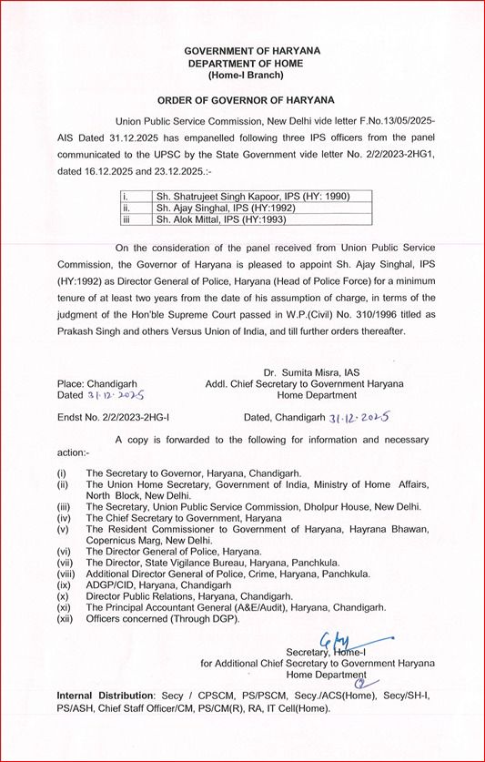 आईपीएस अजय सिंघल, हरियाणा को नया डीजीपी मिल गये हैं। संघ लोक सेवा आयोग की पैनल कमेटी ने डीजीपी पद के दावेदार 3 अधिकारियों के पैनल को अंतिम रूप दिया था, जिसमें से 1992 बैच के आईपीएस अजय सिंघल को हरियाणा पुलिस की जिम्मेदारी सौंपी गई है।