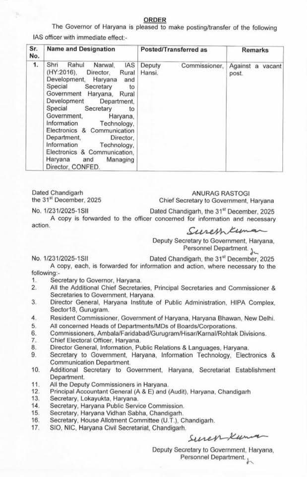हांसी, 31 दिसम्बर, अभीतक: साल 2016 बैच के भारतीय प्रशासनिक सेवा अधिकारी डॉ. राहुल नरवाल हांसी जिले के पहली डीसी होंगे। इसके लिए अधिसूचना जारी हो गई है। हरियाणा सरकार ने हाल ही में हांसी को हिसार जिले से अलग कर राज्य का 23वां जिला घोषित किया है। ब्रिटिश काल में हांसी को जिले का दर्जा प्राप्त था। नई जिले की अधिसूचना जारी होने के साथ ही प्रशासनिक नियुक्तियों की प्रक्रिया भी शुरू हो गई है। साल 2016 बैच के भारतीय प्रशासनिक सेवा अधिकारी डॉ. राहुल नरवाल को हांसी जिले के पहले डिप्टी कमिश्नर (डीसी) होंगे। इसको लेकर अधिसूचना जारी हुई है। डॉ. राहुल नरवाल वर्तमान में हरियाणा सरकार में सूचना प्रौद्योगिकी, इलेक्ट्रॉनिक्स एवं संचार विभाग में निदेशक और विशेष सचिव के पद पर कार्यरत हैं। वे पहले पानीपत में नगर निगम कमिश्नर और बाद में फतेहाबाद और चरखी दादरी जैसे जिलों में डीसी के रूप में अपनी सेवाएं दे चुके हैं।