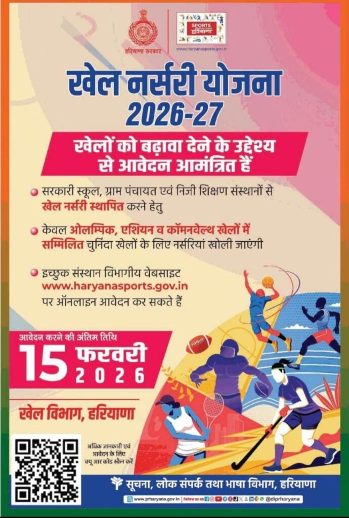 रेवाड़ी, 14 फरवरी, अभीतक: हरियाणा में खेलों को बढ़ावा देने के उद्देश्य से खेल विभाग द्वारा सरकारी स्कूल, ग्राम पंचायत व निजी शिक्षण संस्थानों में खेल नर्सरियां स्थापित की जाएंगी। डीसी अभिषेक मीणा ने यह जानकारी देते हुए बताया कि खेल नर्सरी योजना 2026-27 के तहत सरकारी स्कूल, ग्राम पंचायत व निजी शिक्षण संस्थानों से खेल नर्सरी स्थापित करने के लिए आवेदन आमंत्रित किए गए हैं। इच्छुक संस्थान रविवार, 15 फरवरी, 2026 तक विभागीय वेबसाइट पर ऑनलाइन आवेदन कर सकते हैं। उन्होंने बताया कि खेल नर्सरी के लिए केवल ओलंपिक, एशियन और कॉमनवेल्थ खेलों में सम्मिलित चुनिंदा खेलों के लिए ही नर्सरियां खोली जाएंगी। उन्होंने बताया कि इच्छुक संस्थान 15 फरवरी तक विभाग की वेबसाइट https://haryanasports.gov.in/ पर ऑनलाइन आवेदन कर सकते हैं। इस बारे में अधिक जानकारी एवं आवेदन के लिए रेवाड़ी राव तुलाराम स्टेडियम में स्थित जिला खेल अधिकारी कार्यालय से संपर्क किया जा सकता है।