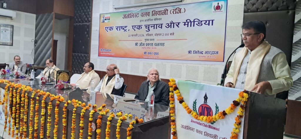 भिवानी। जर्नलिस्ट क्लब भिवानी (रजि.) द्वारा रविवार को पंचायत भवन, कोर्ट रोड स्थित सभागार में ‘एक राष्ट्र, एक चुनाव और मीडिया’ विषय पर एक विस्तृत संगोष्ठी का आयोजन किया गया। कार्यक्रम में शहर के वरिष्ठ पत्रकारों, शिक्षाविदों, सामाजिक कार्यकर्ताओं, अधिवक्ताओं तथा विद्यार्थियों ने उत्साहपूर्वक भाग लिया। संगोष्ठी का उद्देश्य देश में एक साथ चुनाव कराने की अवधारणा, उसके लाभ-चुनौतियों और इस संदर्भ में मीडिया की भूमिका पर सार्थक एवं तथ्यपूर्ण चर्चा करना रहा। मुख्य वक्ता के रूप में भाजपा के राष्ट्रीय सचिव श्री ओम प्रकाश धनखड़ ने कहा कि “एक राष्ट्र, एक चुनाव” व्यवस्था से देश में बार-बार होने वाले चुनावों पर होने वाला खर्च कम किया जा सकता है। उन्होंने कहा कि वर्तमान व्यवस्था में लगातार चुनावी प्रक्रिया चलने से प्रशासनिक मशीनरी और संसाधनों पर अतिरिक्त दबाव पड़ता है। यदि लोकसभा और विधानसभा चुनाव एक साथ संपन्न हों तो शासन व्यवस्था में निरंतरता बनी रहेगी और विकास योजनाओं को गति मिलेगी। उन्होंने यह भी कहा कि चुनाव आचार संहिता के कारण कई बार विकास कार्य प्रभावित होते हैं, जिससे आमजन को असुविधा होती है। उन्होंने मीडिया से अपील की कि वह इस विषय पर संतुलित और जागरूकता बढ़ाने वाली भूमिका निभाए। उन्होंने कहा कि 2047 तक भारतीय विकसित भारत होगा और आज वर्तमान में भारत अर्थव्यवस्था के क्षेत्र में दुनिया में चैथे स्थान पर है उनका कि जब एक राष्ट्र और एक चुनाव होगा तो लाखों करोड़ों व्यर्थ होने वाला पैसा देश के विकास में लगेगा और देश में विकास की गति तेजी से बढ़ेगी। कार्यक्रम की अध्यक्षता करते हुए चैधरी बंसीलाल विश्वविद्यालय के कुलसचिव जितेंद्र भारद्वाज ने कहा कि लोकतंत्र में मीडिया चैथे स्तंभ के रूप में अत्यंत महत्वपूर्ण भूमिका निभाता है। उन्होंने कहा कि किसी भी नीति या सुधार की सफलता नागरिकों की समझ और भागीदारी पर निर्भर करती है। विश्वविद्यालयों और मीडिया संस्थानों की जिम्मेदारी है कि वे युवाओं को तथ्यपरक, निष्पक्ष और जिम्मेदार पत्रकारिता के लिए प्रेरित करें। उन्होंने विद्यार्थियों को लोकतांत्रिक मूल्यों के प्रति सजग रहने का संदेश दिया। अति विशिष्ट अतिथि एवं एक राष्ट्र, एक चुनाव के प्रदेश संयोजक श्री विजय पाल ने कहा कि एक साथ चुनाव होने से नीति निर्माण में स्थिरता आएगी और सरकारें दीर्घकालिक योजनाओं पर अधिक प्रभावी ढंग से कार्य कर सकेंगी। उन्होंने इसे समय की मांग बताते हुए कहा कि इससे प्रशासनिक संसाधनों का बेहतर उपयोग संभव होगा और विकास कार्यों में निरंतरता बनी रहेगी। उन्होंने सफल आयोजन के लिए जर्नलिस्ट क्लब भिवानी को बधाई दी। विशिष्ट वक्ता श्री शंकर धूपड़, सदस्य राष्ट्री
