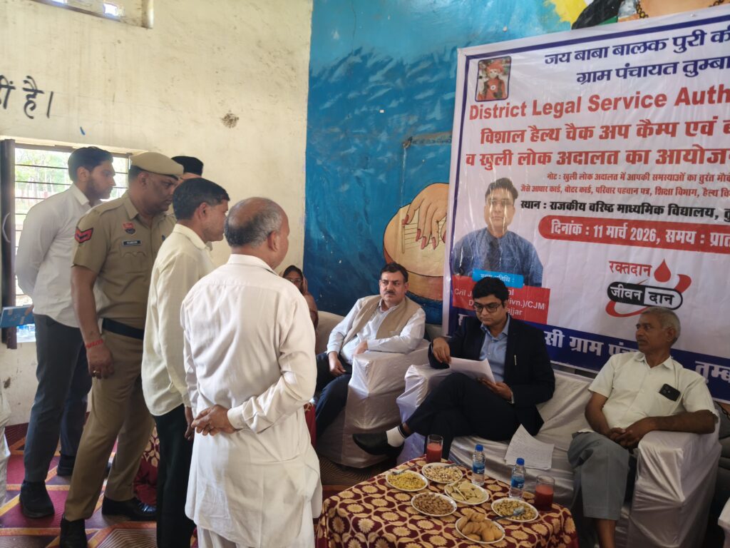 झज्जर, 11 मार्च, अभीतक: जिला विधिक सेवा प्राधिकरण झज्जर के चेयरमैन जिला एवं सत्र न्यायाधीश राजकुमार यादव के कुशल मार्गदर्शन में सचिव एवं सीजेएम विशाल के आदेश अनुसार गांव तुंबाहेडी मे लीगल सर्विस कैंप का आयोजन किया गया। सीजेएम विशाल ने बताया कि इस कैंप में का मुख्य उद्देश्य है कि लोगों को कानूनी जानकारी घर घर तक पहुंचाना। और सरकारी योजनाओं का लाभ एक छत के नीचे मिले। इस कैंप में आधार कार्ड, परिवार पहचान पत्र, बिजली, पानी, राजस्व विभाग, पुलिस विभाग, शिक्षा विभाग, समाज कल्याण विभाग, राशन कार्ड,वन स्टॉप सेंटर, जिला स्वास्थ्य विभाग, जिला आयुर्वेदिक विभाग की ओर से हेल्थ चेकअप कैंप का भी आयोजन किया गया ब्लड डोनेशन कैंप भी लगाया गया। लोगों ने अपनी समस्याओं को सीजेएम के सामने रखा। सीजेएम विशाल ने लोगों की समस्याओं को सुना और कुछ समस्याओं का मौके पर निपटारा किया गया। तथा कुछ समस्याओं को संबंधित विभाग में भेजा गया। लोगो ने इस कैंप में बढ़ चढ़ कर भाग लिया। और लोगों ने आग्रह किया कि यह कैंप तो समय समय पर लगने चाहिए। इस मौके ।ब्च् अखिल, बीडीओ राहुल, एसएचओ परमजीत, ग्राम सचिव सुक्रमपाल, सरपंच प्रतिनिधि वेद प्रकाश, स्कूल प्रिंसिपल संजीव खत्री, जिला विधिक सेवा प्राधिकरण झज्जर से अंकित, कर्मजीत छिल्लर, शिवधन, प्रकाश चंद्र और विभागों के अधिकारियों कर्मचारी मौजूद रहे।