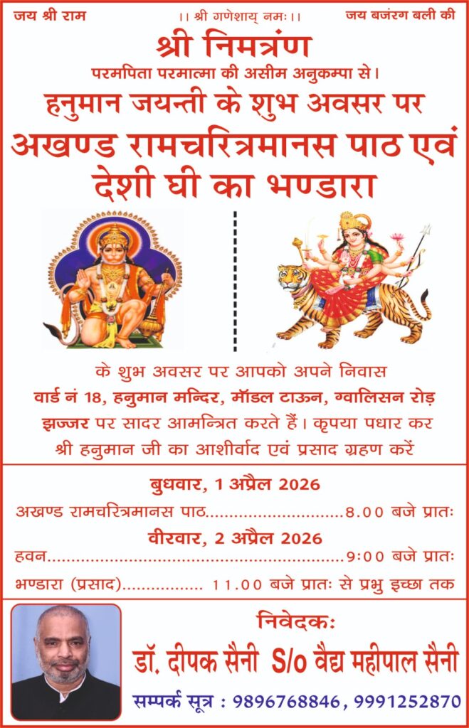 झज्जर, 31 मार्च, अभीतक: मॉडल टाउन ग्वालिसन रोड़ स्थित हनुमान मंदिर में अखंड रामचरितमानस पाठ एवं देसी घी के भंडारे का आयोजन किया जाएगा। मंदिर प्रबंधक महिपाल सैनी ने बताया कि हनुमान जयंती के शुभावसर पर बुधवार एक अप्रैल को सुबह आठ बजे अखंड रामचरितमानस पाठ का शुभारंभ किया जाएगा। वीरवार दो अप्रैल को सुबह नौ बजे हवन के बाद 11 बजे से प्रभु इच्छा तक भंडारे का प्रसाद शुरू किया जाएगा। उन्होंने आव्हान किया कि ज्यादा से ज्यादा संख्या में पहुंचकर हनुमान जी का आशीर्वाद व प्रसाद ग्रहण करें।