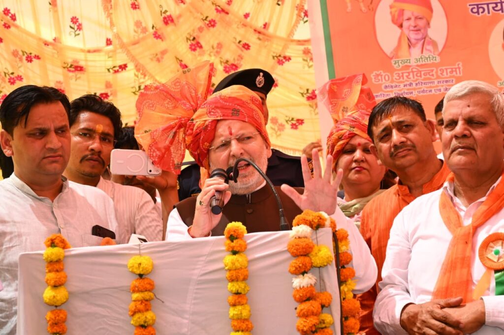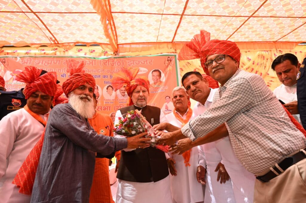 सहकारिता मंत्री का स्वागत करते ब्राह्मण महासभा के पदाधिकारी। समारोह को संबोधित करते हरियाणा के सहकारिता मंत्री डॉ अरविंद शर्मा।